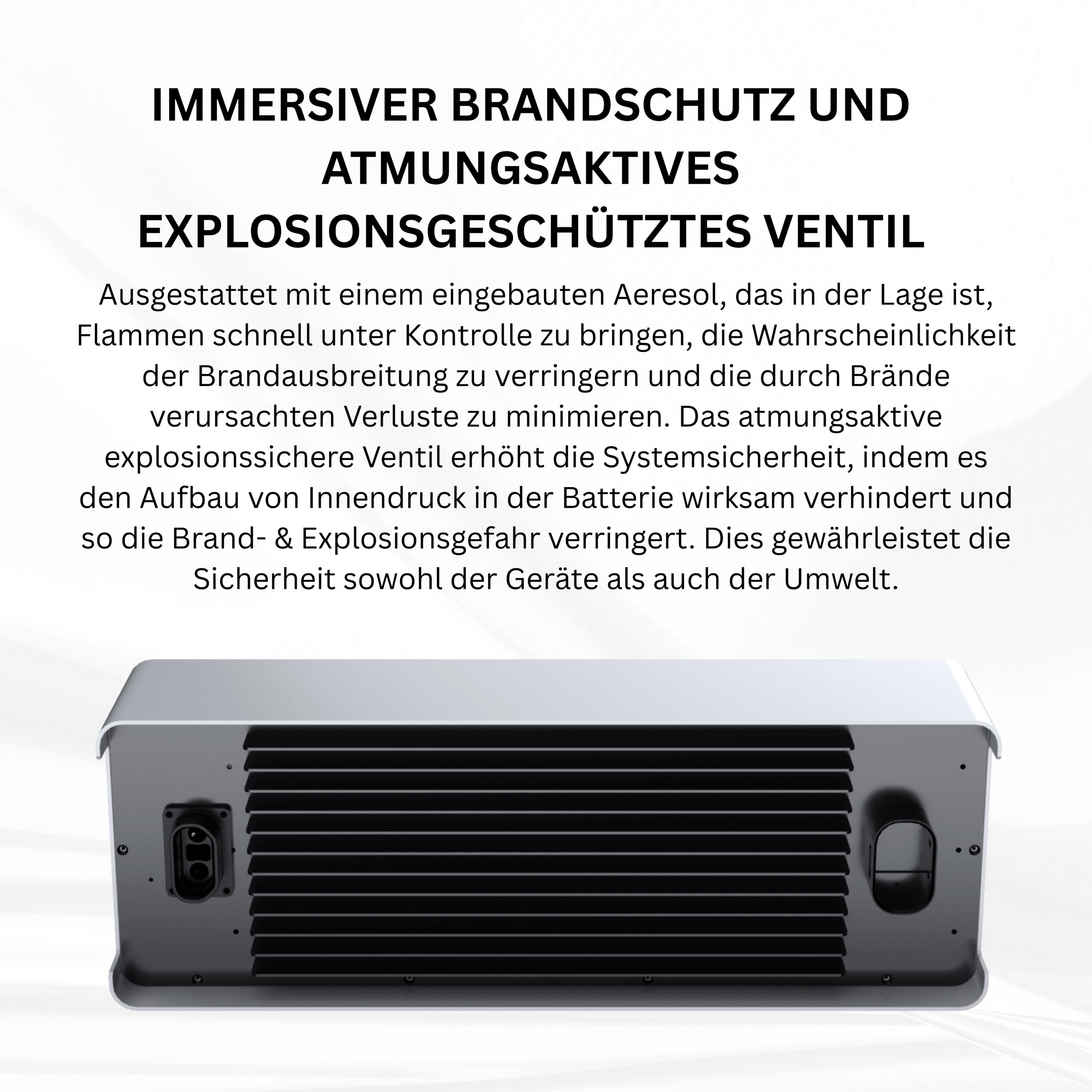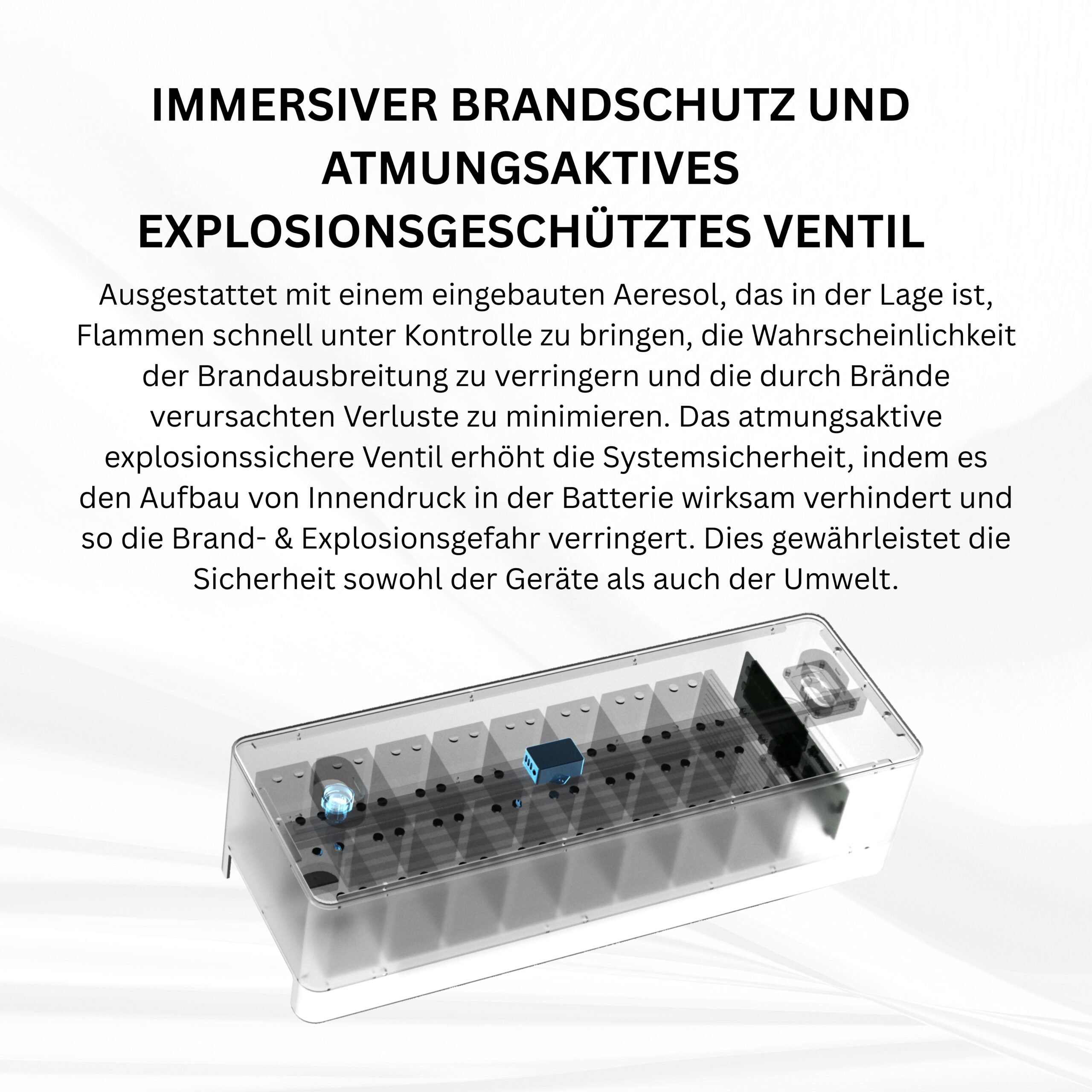 Für ein besonders hohes Sicherheitsniveau verfügt die Batterie über Aerosol-Feuerunterdrückung sowie ein atmungsaktives explosionsgeschütztes Ventil, das den Innendruck reguliert und damit die Gefahr von Brand- oder Explosionsereignissen deutlich senkt.